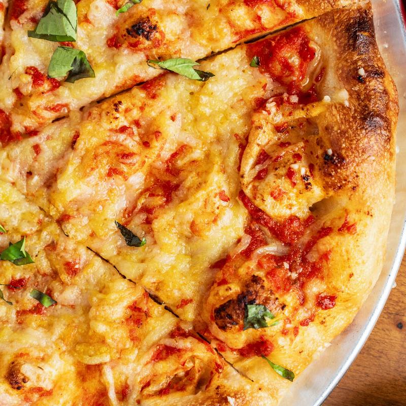 Homemade plum tomato sauce, mozzarella, herbs & fresh basil.